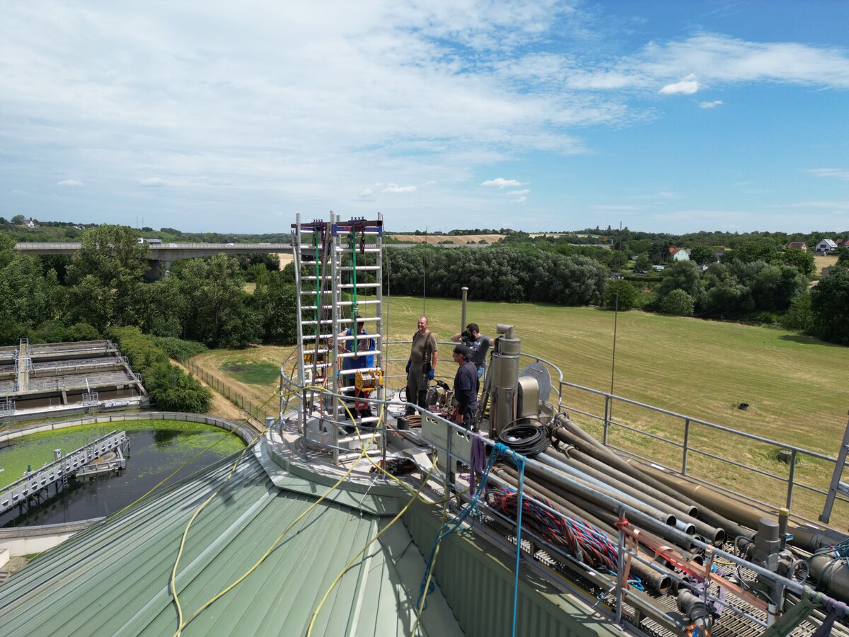 Ein ungewöhnliches Klopfgeräusch im Faulturm weckte im März dieses Jahres die Aufmerksamkeit der Mitarbeitenden der Kläranlage Weißenfels. Der Turm ist das Herzstück der Anlage: Hier vergärt Klärschlamm ohne Luftzutritt, Biogas entsteht. Ein Mischer hält die Masse in Bewegung – doch genau hier wurde die Ursache für das mysteriöse Klopfen vermutet. Die Folgen waren spürbar: Die Gasproduktion sank, die Anlage erzeugte weniger eigenen Strom und es musste mehr Energie zugekauft werden. Außerdem drohte der Schlamm dichter zu werden, was die gesamte Aufbereitung erschwert hätte.